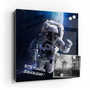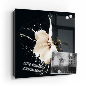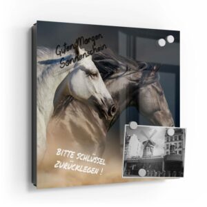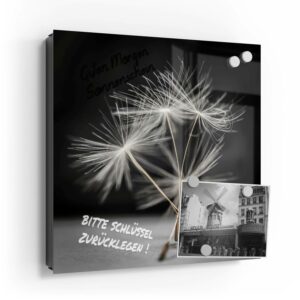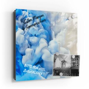 Wer kennt es nicht: Man ist in Eile und der Autoschlüssel ist nicht aufzufinden. Oder er liegt mit vielen anderen Schlüsseln lose und unschön auf der Anrichte. Mit einem Schlüsselkasten erleichterst du dir den Alltag und bringst Ordnung ins Chaos. So ist endlich Schluss mit der Sucherei und dein Flur bleibt aufgeräumt. Im Design Schlüsselkasten finden auch selten genutzte Schlüssel einen Platz und können übersichtlich aufgehängt werden. Zum praktischen Alltagshelfer wird der Schlüsselkasten, da er auch als kleines Notizbrett dient: Er kann einfach mit einem abwischbaren Marker beschrieben werden. Sehr gut sind dafür zum Beispiel Kreidemarker geeignet, mit denen du Botschaften an deine Liebsten hinterlassen kannst oder einfach wichtige Termine notierst. Die Oberfläche des Glases ist äußerst kratz- und schlagfest und damit langlebig, auch wenn der Kasten täglich genutzt wird. Das Glas wird mit einer hochwertig bedruckten Folie versehen, die farbecht ist. Fotos und Kunstwerke wirken damit immer gestochen scharf und durch die Glasoberfläche schon fast dreidimensional. Somit wird der Schlüsselkasten selbst zum Designobjekt.