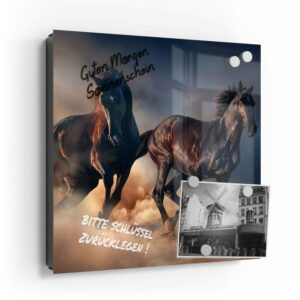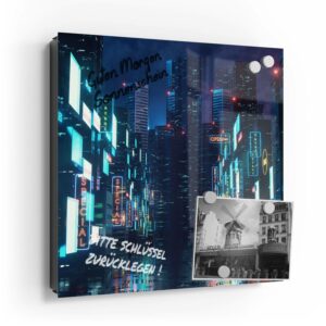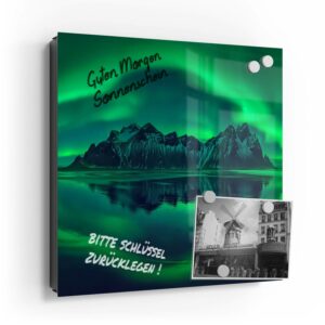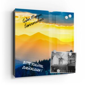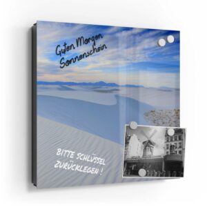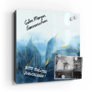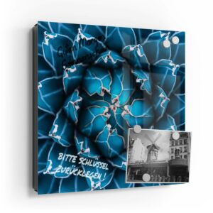 Wer kennt es nicht: Man ist in Eile und der Autoschlüssel ist nicht aufzufinden. Oder er liegt mit vielen anderen Schlüsseln lose und unschön auf der Anrichte. Mit einem Schlüsselkasten erleichterst du dir den Alltag und bringst Ordnung ins Chaos. So ist endlich Schluss mit der Sucherei und dein Flur bleibt aufgeräumt. Im Design Schlüsselkasten finden auch selten genutzte Schlüssel einen Platz und können übersichtlich aufgehängt werden. Zum praktischen Alltagshelfer wird der Schlüsselkasten, da er auch als kleines Notizbrett dient: Er kann einfach mit einem abwischbaren Marker beschrieben werden. Sehr gut sind dafür zum Beispiel Kreidemarker geeignet, mit denen du Botschaften an deine Liebsten hinterlassen kannst oder einfach wichtige Termine notierst. Die Oberfläche des Glases ist äußerst kratz- und schlagfest und damit langlebig, auch wenn der Kasten täglich genutzt wird. Das Glas wird mit einer hochwertig bedruckten Folie versehen, die farbecht ist. Fotos und Kunstwerke wirken damit immer gestochen scharf und durch die Glasoberfläche schon fast dreidimensional. Somit wird der Schlüsselkasten selbst zum Designobjekt.