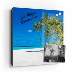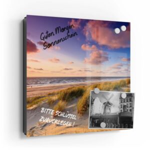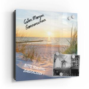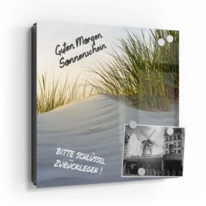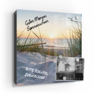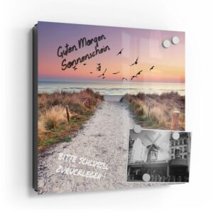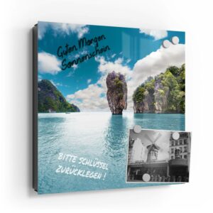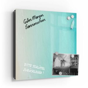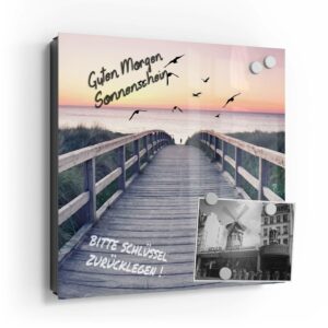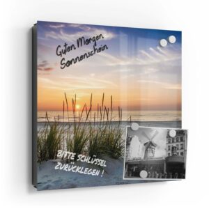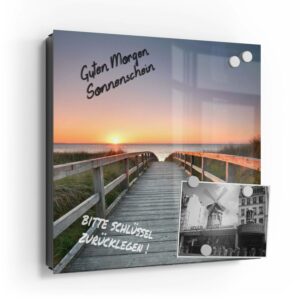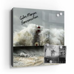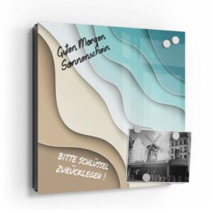 Wer kennt es nicht: Man ist in Eile und der Autoschlüssel ist nicht aufzufinden. Oder er liegt mit vielen anderen Schlüsseln lose und unschön auf der Anrichte. Mit einem Schlüsselkasten erleichterst du dir den Alltag und bringst Ordnung ins Chaos. So ist endlich Schluss mit der Sucherei und dein Flur bleibt aufgeräumt. Im Design Schlüsselkasten finden auch selten genutzte Schlüssel einen Platz und können übersichtlich aufgehängt werden. Zum praktischen Alltagshelfer wird der Schlüsselkasten, da er auch als kleines Notizbrett dient: Er kann einfach mit einem abwischbaren Marker beschrieben werden. Sehr gut sind dafür zum Beispiel Kreidemarker geeignet, mit denen du Botschaften an deine Liebsten hinterlassen kannst oder einfach wichtige Termine notierst. Die Oberfläche des Glases ist äußerst kratz- und schlagfest und damit langlebig, auch wenn der Kasten täglich genutzt wird. Das Glas wird mit einer hochwertig bedruckten Folie versehen, die farbecht ist. Fotos und Kunstwerke wirken damit immer gestochen scharf und durch die Glasoberfläche schon fast dreidimensional. Somit wird der Schlüsselkasten selbst zum Designobjekt.