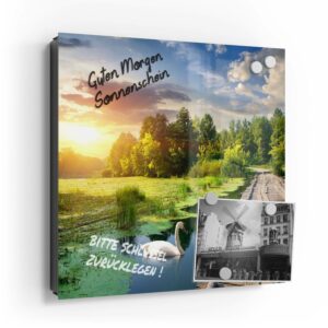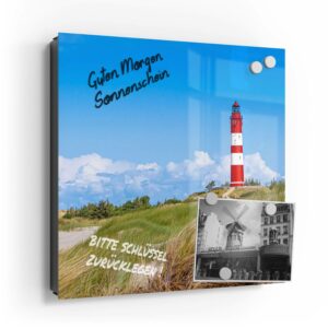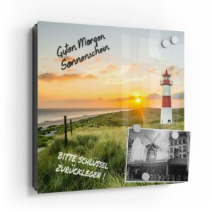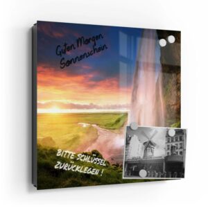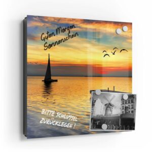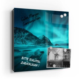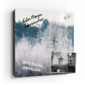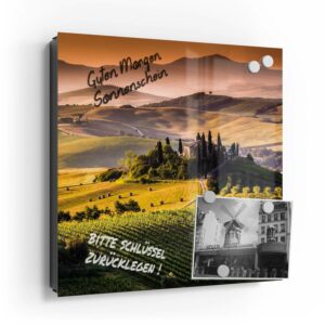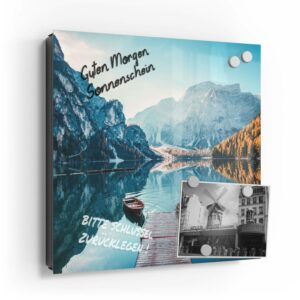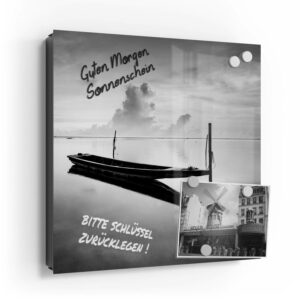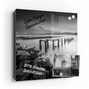 Wer kennt es nicht: Man ist in Eile und der Autoschlüssel ist nicht aufzufinden. Oder er liegt mit vielen anderen Schlüsseln lose und unschön auf der Anrichte. Mit einem Schlüsselkasten erleichterst du dir den Alltag und bringst Ordnung ins Chaos. So ist endlich Schluss mit der Sucherei und dein Flur bleibt aufgeräumt. Im Design Schlüsselkasten finden auch selten genutzte Schlüssel einen Platz und können übersichtlich aufgehängt werden. Zum praktischen Alltagshelfer wird der Schlüsselkasten, da er auch als kleines Notizbrett dient: Er kann einfach mit einem abwischbaren Marker beschrieben werden. Sehr gut sind dafür zum Beispiel Kreidemarker geeignet, mit denen du Botschaften an deine Liebsten hinterlassen kannst oder einfach wichtige Termine notierst. Die Oberfläche des Glases ist äußerst kratz- und schlagfest und damit langlebig, auch wenn der Kasten täglich genutzt wird. Das Glas wird mit einer hochwertig bedruckten Folie versehen, die farbecht ist. Fotos und Kunstwerke wirken damit immer gestochen scharf und durch die Glasoberfläche schon fast dreidimensional. Somit wird der Schlüsselkasten selbst zum Designobjekt.