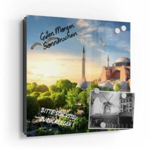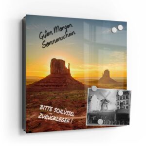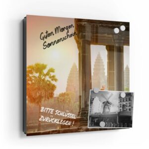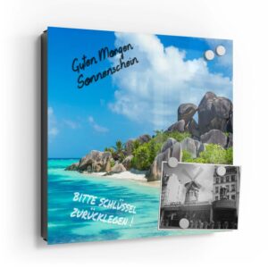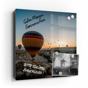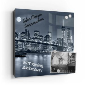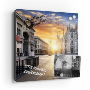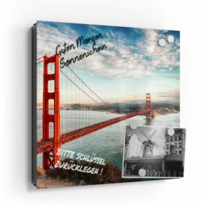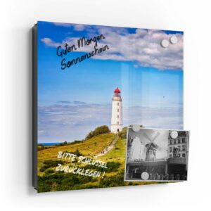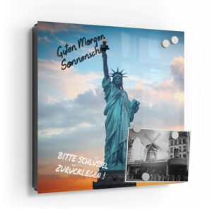 Wer kennt es nicht: Man ist in Eile und der Autoschlüssel ist nicht aufzufinden. Oder er liegt mit vielen anderen Schlüsseln lose und unschön auf der Anrichte. Mit einem Schlüsselkasten erleichterst du dir den Alltag und bringst Ordnung ins Chaos. So ist endlich Schluss mit der Sucherei und dein Flur bleibt aufgeräumt. Im Design Schlüsselkasten finden auch selten genutzte Schlüssel einen Platz und können übersichtlich aufgehängt werden. Zum praktischen Alltagshelfer wird der Schlüsselkasten, da er auch als kleines Notizbrett dient: Er kann einfach mit einem abwischbaren Marker beschrieben werden. Sehr gut sind dafür zum Beispiel Kreidemarker geeignet, mit denen du Botschaften an deine Liebsten hinterlassen kannst oder einfach wichtige Termine notierst. Die Oberfläche des Glases ist äußerst kratz- und schlagfest und damit langlebig, auch wenn der Kasten täglich genutzt wird. Das Glas wird mit einer hochwertig bedruckten Folie versehen, die farbecht ist. Fotos und Kunstwerke wirken damit immer gestochen scharf und durch die Glasoberfläche schon fast dreidimensional. Somit wird der Schlüsselkasten selbst zum Designobjekt.