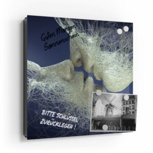 Wer kennt es nicht: Man ist in Eile und der Autoschlüssel ist nicht aufzufinden. Oder er liegt mit vielen anderen Schlüsseln lose und unschön auf der Anrichte. Mit einem Schlüsselkasten erleichterst du dir den Alltag und bringst Ordnung ins Chaos. So ist endlich Schluss mit der Sucherei und dein Flur bleibt aufgeräumt. Im Design Schlüsselkasten finden auch selten genutzte Schlüssel einen Platz und können übersichtlich aufgehängt werden. Zum praktischen Alltagshelfer wird der Schlüsselkasten, da er auch als kleines Notizbrett dient: Er kann einfach mit einem abwischbaren Marker beschrieben werden. Sehr gut sind dafür zum Beispiel Kreidemarker geeignet, mit denen du Botschaften an deine Liebsten hinterlassen kannst oder einfach wichtige Termine notierst. Die Oberfläche des Glases ist äußerst kratz- und schlagfest und damit langlebig, auch wenn der Kasten täglich genutzt wird. Das Glas wird mit einer hochwertig bedruckten Folie versehen, die farbecht ist. Fotos und Kunstwerke wirken damit immer gestochen scharf und durch die Glasoberfläche schon fast dreidimensional. Somit wird der Schlüsselkasten selbst zum Designobjekt.