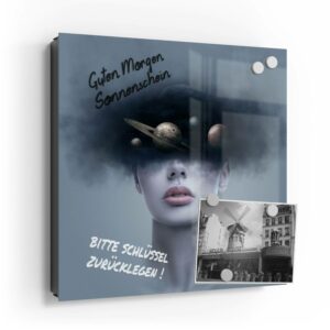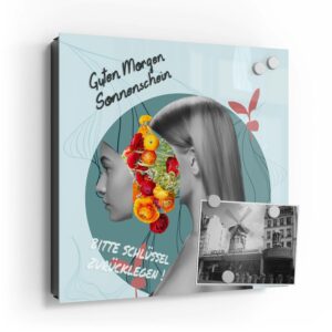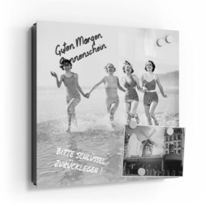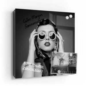 Wer kennt es nicht: Man ist in Eile und der Autoschlüssel ist nicht aufzufinden. Oder er liegt mit vielen anderen Schlüsseln lose und unschön auf der Anrichte. Mit einem Schlüsselkasten erleichterst du dir den Alltag und bringst Ordnung ins Chaos. So ist endlich Schluss mit der Sucherei und dein Flur bleibt aufgeräumt. Im Design Schlüsselkasten finden auch selten genutzte Schlüssel einen Platz und können übersichtlich aufgehängt werden. Zum praktischen Alltagshelfer wird der Schlüsselkasten, da er auch als kleines Notizbrett dient: Er kann einfach mit einem abwischbaren Marker beschrieben werden. Sehr gut sind dafür zum Beispiel Kreidemarker geeignet, mit denen du Botschaften an deine Liebsten hinterlassen kannst oder einfach wichtige Termine notierst. Die Oberfläche des Glases ist äußerst kratz- und schlagfest und damit langlebig, auch wenn der Kasten täglich genutzt wird. Das Glas wird mit einer hochwertig bedruckten Folie versehen, die farbecht ist. Fotos und Kunstwerke wirken damit immer gestochen scharf und durch die Glasoberfläche schon fast dreidimensional. Somit wird der Schlüsselkasten selbst zum Designobjekt.