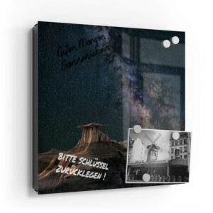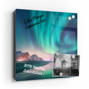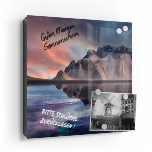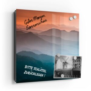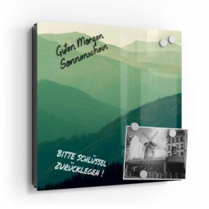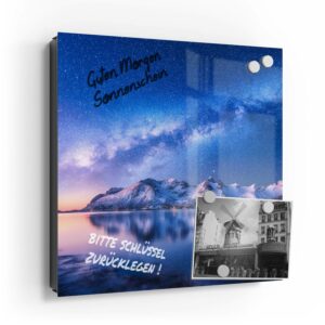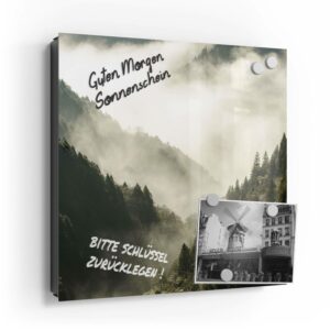 Wer kennt es nicht: Man ist in Eile und der Autoschlüssel ist nicht aufzufinden. Oder er liegt mit vielen anderen Schlüsseln lose und unschön auf der Anrichte. Mit einem Schlüsselkasten erleichterst du dir den Alltag und bringst Ordnung ins Chaos. So ist endlich Schluss mit der Sucherei und dein Flur bleibt aufgeräumt. Im Design Schlüsselkasten finden auch selten genutzte Schlüssel einen Platz und können übersichtlich aufgehängt werden. Zum praktischen Alltagshelfer wird der Schlüsselkasten, da er auch als kleines Notizbrett dient: Er kann einfach mit einem abwischbaren Marker beschrieben werden. Sehr gut sind dafür zum Beispiel Kreidemarker geeignet, mit denen du Botschaften an deine Liebsten hinterlassen kannst oder einfach wichtige Termine notierst. Die Oberfläche des Glases ist äußerst kratz- und schlagfest und damit langlebig, auch wenn der Kasten täglich genutzt wird. Das Glas wird mit einer hochwertig bedruckten Folie versehen, die farbecht ist. Fotos und Kunstwerke wirken damit immer gestochen scharf und durch die Glasoberfläche schon fast dreidimensional. Somit wird der Schlüsselkasten selbst zum Designobjekt.