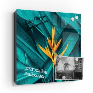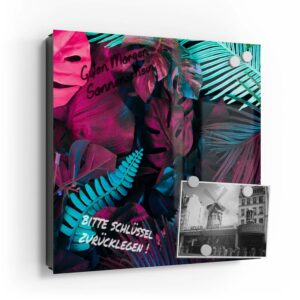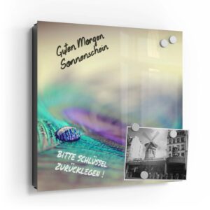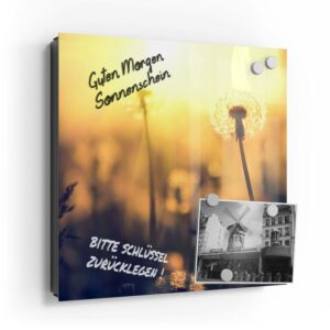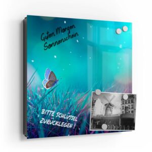 Wer kennt es nicht: Man ist in Eile und der Autoschlüssel ist nicht aufzufinden. Oder er liegt mit vielen anderen Schlüsseln lose und unschön auf der Anrichte. Mit einem Schlüsselkasten erleichterst du dir den Alltag und bringst Ordnung ins Chaos. So ist endlich Schluss mit der Sucherei und dein Flur bleibt aufgeräumt. Im Design Schlüsselkasten finden auch selten genutzte Schlüssel einen Platz und können übersichtlich aufgehängt werden. Zum praktischen Alltagshelfer wird der Schlüsselkasten, da er auch als kleines Notizbrett dient: Er kann einfach mit einem abwischbaren Marker beschrieben werden. Sehr gut sind dafür zum Beispiel Kreidemarker geeignet, mit denen du Botschaften an deine Liebsten hinterlassen kannst oder einfach wichtige Termine notierst. Die Oberfläche des Glases ist äußerst kratz- und schlagfest und damit langlebig, auch wenn der Kasten täglich genutzt wird. Das Glas wird mit einer hochwertig bedruckten Folie versehen, die farbecht ist. Fotos und Kunstwerke wirken damit immer gestochen scharf und durch die Glasoberfläche schon fast dreidimensional. Somit wird der Schlüsselkasten selbst zum Designobjekt.