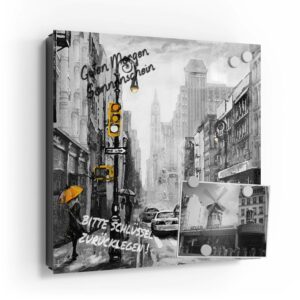 Deinen Design Schlüsselkasten kannst du in unserem Shop DEQORI ganz einfach selbst zusammenstellen. Durch die Wahl eines unserer tollen Bilder – von einzigartigen Fotos bis hin zur Pop Art – gestaltest du deinen Schlüsselkasten genau so, dass er dir und deinem Geschmack entspricht. Der moderne Schlüsselkasten kann so zum Beispiel die Skyline deiner Lieblingsstadt zeigen, deine Fussballleidenschaft widerspiegeln oder in mit einer stilechten Steinoptik versehen sein. Sehr schön kommen durch das Glas Motive mit Metalltönen zur Geltung, die je nach Lichteinfall attraktiv schimmern. Bei DEQORI werden immer wieder neue Motive angeboten, unter denen sicherlich auch etwas für dein Zuhause ist.