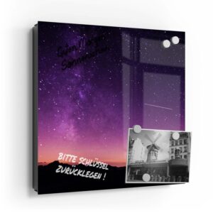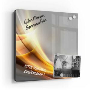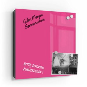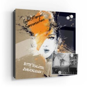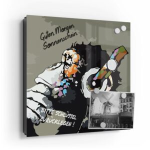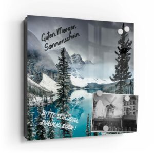 Wer kennt es nicht: Man ist in Eile und der Autoschlüssel ist nicht aufzufinden. Oder er liegt mit vielen anderen Schlüsseln lose und unschön auf der Anrichte. Mit einem Schlüsselkasten erleichterst du dir den Alltag und bringst Ordnung ins Chaos. So ist endlich Schluss mit der Sucherei und dein Flur bleibt aufgeräumt. Im Design Schlüsselkasten finden auch selten genutzte Schlüssel einen Platz und können übersichtlich aufgehängt werden. Zum praktischen Alltagshelfer wird der Schlüsselkasten, da er auch als kleines Notizbrett dient: Er kann einfach mit einem abwischbaren Marker beschrieben werden. Sehr gut sind dafür zum Beispiel Kreidemarker geeignet, mit denen du Botschaften an deine Liebsten hinterlassen kannst oder einfach wichtige Termine notierst. Die Oberfläche des Glases ist äußerst kratz- und schlagfest und damit langlebig, auch wenn der Kasten täglich genutzt wird. Das Glas wird mit einer hochwertig bedruckten Folie versehen, die farbecht ist. Fotos und Kunstwerke wirken damit immer gestochen scharf und durch die Glasoberfläche schon fast dreidimensional. Somit wird der Schlüsselkasten selbst zum Designobjekt.