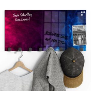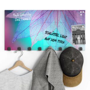 Gerade einfarbige oder ruhig gemusterte Garderoben mit Motiv eignen sich wunderbar, um sie gleichzeitig als kleine Pinn- und Notizwand zu nutzen. Mit einem abwischbaren Marker kannst du deinen Lieben Botschaften hinterlassen, wichtige Daten notieren oder dir einfach ein Motto ausdenken, das du je nach Jahreszeit und Anlass erneuerst. Da sich auf der Rückseite eine Metalloberfläche befindet, kannst du die Garderobenpaneele mit starken Magneten (Neodym-Magneten) auch dazu verwenden, hier Fotos und Notizen anzupinnen. Diese Zusatzfunktion ist nicht nur für Familien eine tolle Möglichkeit, begrenzten Wohnraum zu nutzen und den Alltag strukturieren. Egal ob beim Heimkommen oder beim Ausgehen – hier wirst du an alles Wichtige erinnert, was du noch zu erledigen hast.
