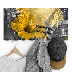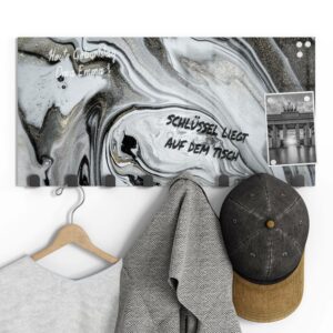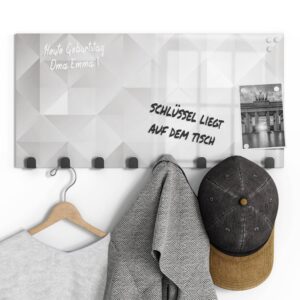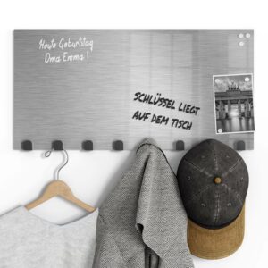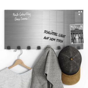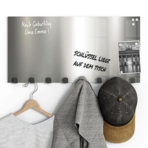 Gerade einfarbige oder ruhig gemusterte Garderoben mit Motiv eignen sich wunderbar, um sie gleichzeitig als kleine Pinn- und Notizwand zu nutzen. Mit einem abwischbaren Marker kannst du deinen Lieben Botschaften hinterlassen, wichtige Daten notieren oder dir einfach ein Motto ausdenken, das du je nach Jahreszeit und Anlass erneuerst. Da sich auf der Rückseite eine Metalloberfläche befindet, kannst du die Garderobenpaneele mit starken Magneten (Neodym-Magneten) auch dazu verwenden, hier Fotos und Notizen anzupinnen. Diese Zusatzfunktion ist nicht nur für Familien eine tolle Möglichkeit, begrenzten Wohnraum zu nutzen und den Alltag strukturieren. Egal ob beim Heimkommen oder beim Ausgehen – hier wirst du an alles Wichtige erinnert, was du noch zu erledigen hast.