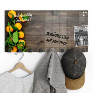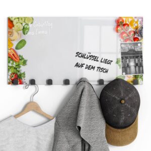 Gerade einfarbige oder ruhig gemusterte Garderoben mit Motiv eignen sich wunderbar, um sie gleichzeitig als kleine Pinn- und Notizwand zu nutzen. Mit einem abwischbaren Marker kannst du deinen Lieben Botschaften hinterlassen, wichtige Daten notieren oder dir einfach ein Motto ausdenken, das du je nach Jahreszeit und Anlass erneuerst. Da sich auf der Rückseite eine Metalloberfläche befindet, kannst du die Garderobenpaneele mit starken Magneten (Neodym-Magneten) auch dazu verwenden, hier Fotos und Notizen anzupinnen. Diese Zusatzfunktion ist nicht nur für Familien eine tolle Möglichkeit, begrenzten Wohnraum zu nutzen und den Alltag strukturieren. Egal ob beim Heimkommen oder beim Ausgehen – hier wirst du an alles Wichtige erinnert, was du noch zu erledigen hast.
