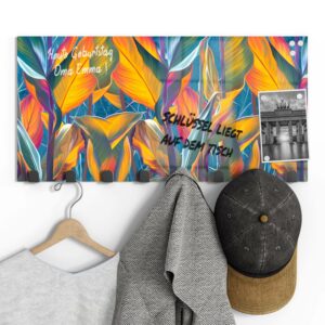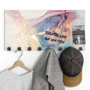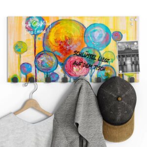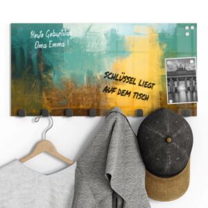 Gerade einfarbige oder ruhig gemusterte Garderoben mit Motiv eignen sich wunderbar, um sie gleichzeitig als kleine Pinn- und Notizwand zu nutzen. Mit einem abwischbaren Marker kannst du deinen Lieben Botschaften hinterlassen, wichtige Daten notieren oder dir einfach ein Motto ausdenken, das du je nach Jahreszeit und Anlass erneuerst. Da sich auf der Rückseite eine Metalloberfläche befindet, kannst du die Garderobenpaneele mit starken Magneten (Neodym-Magneten) auch dazu verwenden, hier Fotos und Notizen anzupinnen. Diese Zusatzfunktion ist nicht nur für Familien eine tolle Möglichkeit, begrenzten Wohnraum zu nutzen und den Alltag strukturieren. Egal ob beim Heimkommen oder beim Ausgehen – hier wirst du an alles Wichtige erinnert, was du noch zu erledigen hast.