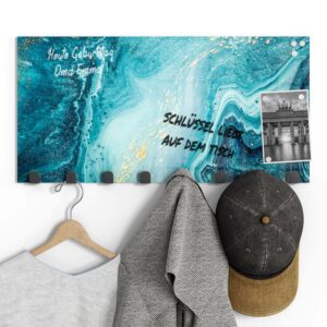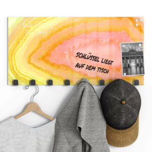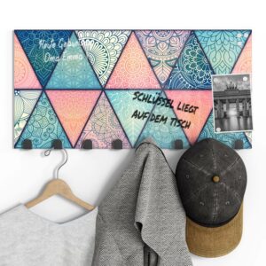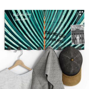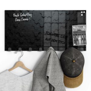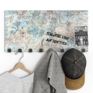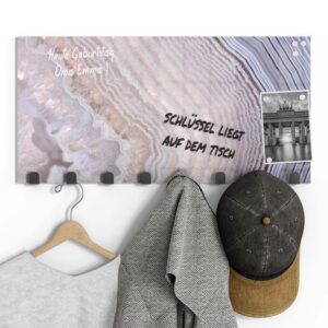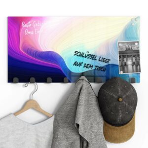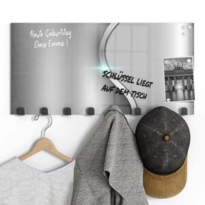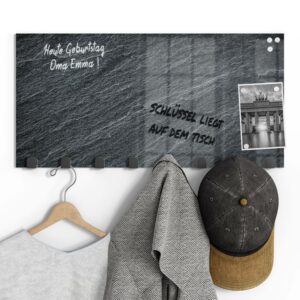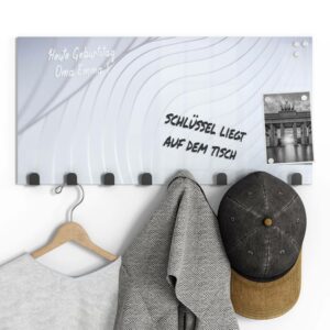 Gerade einfarbige oder ruhig gemusterte Garderoben mit Motiv eignen sich wunderbar, um sie gleichzeitig als kleine Pinn- und Notizwand zu nutzen. Mit einem abwischbaren Marker kannst du deinen Lieben Botschaften hinterlassen, wichtige Daten notieren oder dir einfach ein Motto ausdenken, das du je nach Jahreszeit und Anlass erneuerst. Da sich auf der Rückseite eine Metalloberfläche befindet, kannst du die Garderobenpaneele mit starken Magneten (Neodym-Magneten) auch dazu verwenden, hier Fotos und Notizen anzupinnen. Diese Zusatzfunktion ist nicht nur für Familien eine tolle Möglichkeit, begrenzten Wohnraum zu nutzen und den Alltag strukturieren. Egal ob beim Heimkommen oder beim Ausgehen – hier wirst du an alles Wichtige erinnert, was du noch zu erledigen hast.