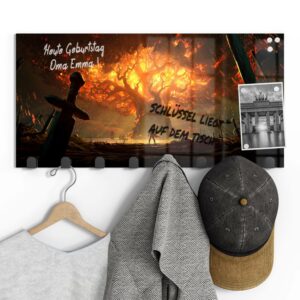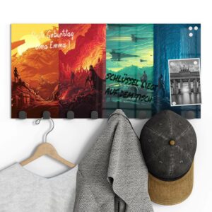 Gerade einfarbige oder ruhig gemusterte Garderoben mit Motiv eignen sich wunderbar, um sie gleichzeitig als kleine Pinn- und Notizwand zu nutzen. Mit einem abwischbaren Marker kannst du deinen Lieben Botschaften hinterlassen, wichtige Daten notieren oder dir einfach ein Motto ausdenken, das du je nach Jahreszeit und Anlass erneuerst. Da sich auf der Rückseite eine Metalloberfläche befindet, kannst du die Garderobenpaneele mit starken Magneten (Neodym-Magneten) auch dazu verwenden, hier Fotos und Notizen anzupinnen. Diese Zusatzfunktion ist nicht nur für Familien eine tolle Möglichkeit, begrenzten Wohnraum zu nutzen und den Alltag strukturieren. Egal ob beim Heimkommen oder beim Ausgehen – hier wirst du an alles Wichtige erinnert, was du noch zu erledigen hast.