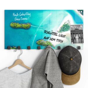 Gerade einfarbige oder ruhig gemusterte Garderoben mit Motiv eignen sich wunderbar, um sie gleichzeitig als kleine Pinn- und Notizwand zu nutzen. Mit einem abwischbaren Marker kannst du deinen Lieben Botschaften hinterlassen, wichtige Daten notieren oder dir einfach ein Motto ausdenken, das du je nach Jahreszeit und Anlass erneuerst. Da sich auf der Rückseite eine Metalloberfläche befindet, kannst du die Garderobenpaneele mit starken Magneten (Neodym-Magneten) auch dazu verwenden, hier Fotos und Notizen anzupinnen. Diese Zusatzfunktion ist nicht nur für Familien eine tolle Möglichkeit, begrenzten Wohnraum zu nutzen und den Alltag strukturieren. Egal ob beim Heimkommen oder beim Ausgehen – hier wirst du an alles Wichtige erinnert, was du noch zu erledigen hast.