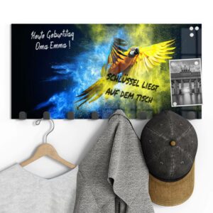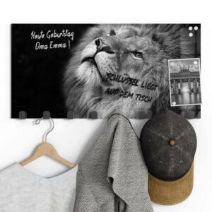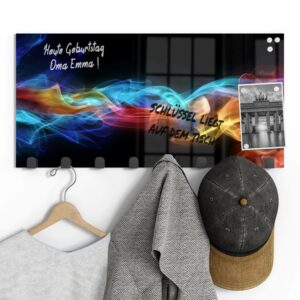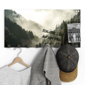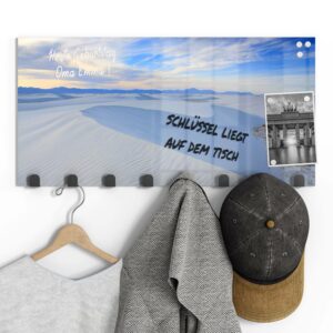 Gerade einfarbige oder ruhig gemusterte Garderoben mit Motiv eignen sich wunderbar, um sie gleichzeitig als kleine Pinn- und Notizwand zu nutzen. Mit einem abwischbaren Marker kannst du deinen Lieben Botschaften hinterlassen, wichtige Daten notieren oder dir einfach ein Motto ausdenken, das du je nach Jahreszeit und Anlass erneuerst. Da sich auf der Rückseite eine Metalloberfläche befindet, kannst du die Garderobenpaneele mit starken Magneten (Neodym-Magneten) auch dazu verwenden, hier Fotos und Notizen anzupinnen. Diese Zusatzfunktion ist nicht nur für Familien eine tolle Möglichkeit, begrenzten Wohnraum zu nutzen und den Alltag strukturieren. Egal ob beim Heimkommen oder beim Ausgehen – hier wirst du an alles Wichtige erinnert, was du noch zu erledigen hast.